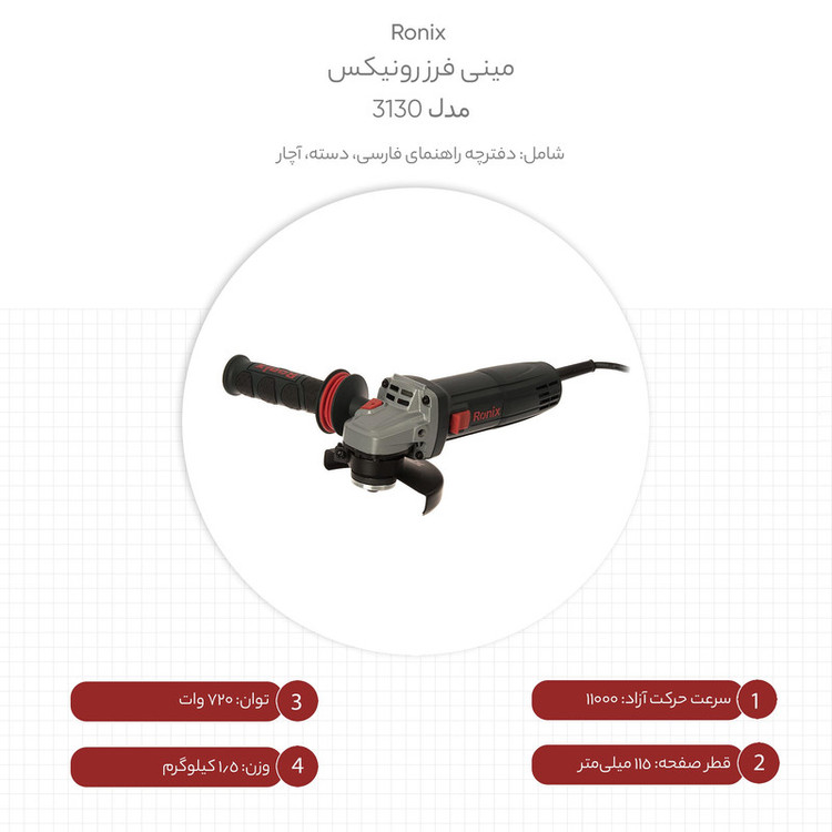 دستگاه مینی فرز فوق یکی از محصولات تولیدی شرکت «رونیکس» (Ronix) است. این محصول برای برش و ساب مورد استفاده قرار میگیرد و باتوجه به سایزی که دارد میتوان از آن برای انجام بسیاری از امور استفاده کرد. سرعت گردش این مینی فرز 11000 دور بر دقیقه بوده که آن را به گزینهای مناسب برای کار با فلز تبدیل کرده است. در صورت داشتن تخصص میتوان از این مینی فرز برای برش سنگ نیز استفاده کرد؛ البته این موضوع را باید مد نظر قرار داد که سرعت بالای چرخش میتواند موجب شکسته شدن سنگ شود. توان این دستگاه 750 وات بوده و قطر صفحهی آن 115 میلیمتر است. از دیگر مزایای این مینی فرز میتوان به امکان نصب دستهی کمکی در دو سمت دستگاه اشاره کرد. وجود این دسته موجب تسلط بیشتر کاربر در حین کار میشود. این محصول کابل برقی 3 متری دارد و شرکت رونیکس آن را تحت عنوان مدل «3130» به بازار عرضه میکند.