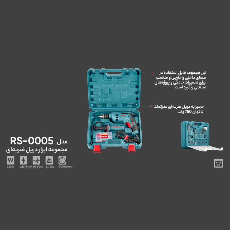 ست کیف ابزار رونیکس مدل RS-0005، مجموعه کاملی از یک دریل چکشی و انواع مته و سر پیچگوشتی های مختلف است. این مجموعه کامل، برای استفاده در مصارف خانگی و صنعتی به کار شما میآیند. این ست کیف ابزار، در یک کیف مقاوم به ضربه BMC به بازار ابزار ایران و جهان عرضه میشود. دریل موجود در ست کیف ابزار 54 تایی رونیکس مدل RH-0005، مجهز به یک موتور 750 واتی بسیار قدرتمند برای بهترین کارایی در سوراخکاری و دریلکاری چکشی است و میتواند با سرعتی بالغ بر 2700 دور در دقیقه کار کند. سهنظام این دریل، آچاری و تمامفلزی بوده و با ظرفیت 13-1.5 میلیمتر کار میکند. مجموعه ابزارآلات و قطعات موجود در این کیت، در صنایع چوبی، فلزی و ساختمانی مورد استفاده قرار میگیرند.