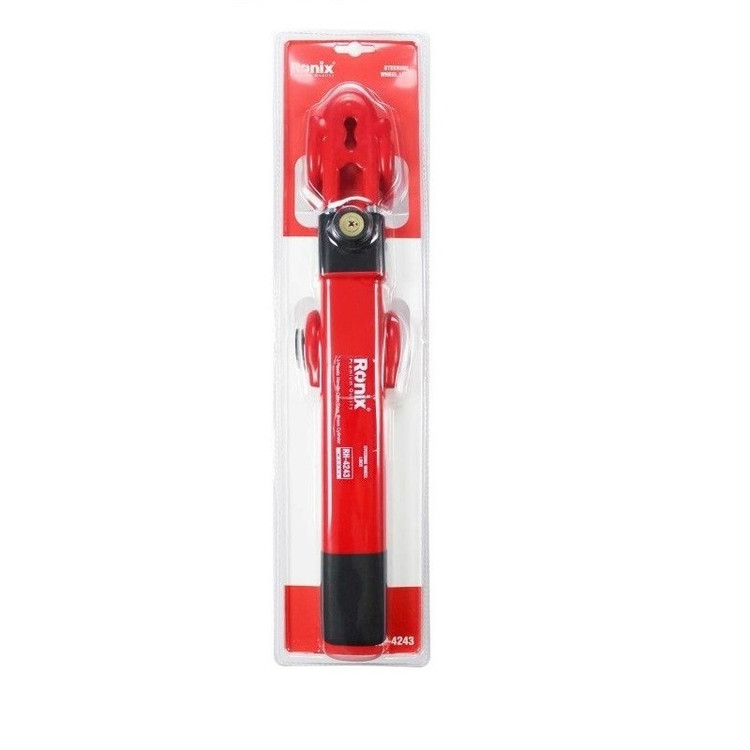 قفل فرمان دوبل رونیکس مدل RH-4243 ساخت کشور چین بدنه ای تولید شده از فولاد مقاوم و مستحکم در برابر ضربه و برش دارای قفل و مغزی از جنس برنج با مقاومت بالا در برابر انواع سوراخ کاری مجهز به روکش PVC در قسمت U شکل جهت افزایش حفاظت از فرمان توانایی تنظیم ساده و آسان جهت منطبق شدن با هر قطر فرمان پوشش لاستیکی نرم در ابتدا و انتها جهت محافظت قطعات داخل خودرو توانایی قفل همزمان فرمان و پدال جهت افزایش امنیت و ایمنی توانایی تنظیم حداقل و حداکثر طول قفل از 140 تا 230 میلی متر بدنه ای خوش فرم و ارگونومیک به همراه 3 عدد کلید برنجی کامپیوتری